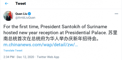 Verschillende Chinese media, waaronder China News Network, Overseas Chinese Network, USA Phoenix News en ChinaNews.com (https://m.chinanews.com/wap/detail/zw/hr/2020/12-12/9360369.shtml?fbclid=IwAR3QSNdlCHF7xCIy7Y_P4PTurdyi6mCvy5WgoPf4NgUhpP2PjaP4Vp-mWP4) hebben bericht, dat president Chandrikapersad Santokhi op 12 december 2020 een nieuwjaarsreceptie heeft gehouden voor de Chinese gemeenschap in het presidentieel paleis. De bijeenkomst werd bijgewoond onder andere door de Chinese ambassadeur Liu Quan, vertegenwoordigers van de diverse Chinese verenigingen en, vertegenwoordigers van verschillende overzeese Chinese delegaties. Dit bericht de Communicatie Dienst Suriname woensdag 6 januari.