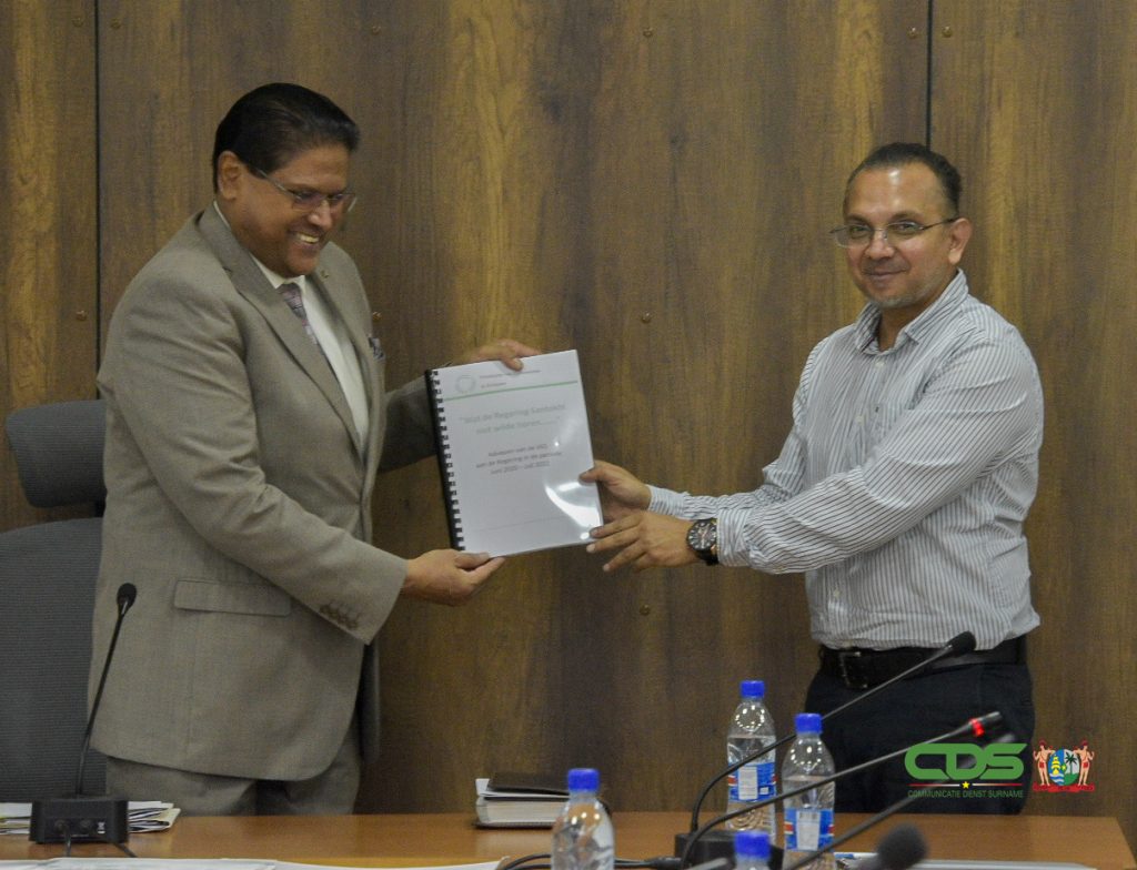 De regeringsleider heeft uit handen van VES-voorzitter Steven Debipersad een boekwerk met adviezen van de organisatie ontvangen. President Santokhi zei de adviezen ter harte te zullen nemen. Begin volgende week komen partijen weer bij elkaar om uitgebreid van gedachten te wisselen over verscheidene economische en monetaire vraagstukken.