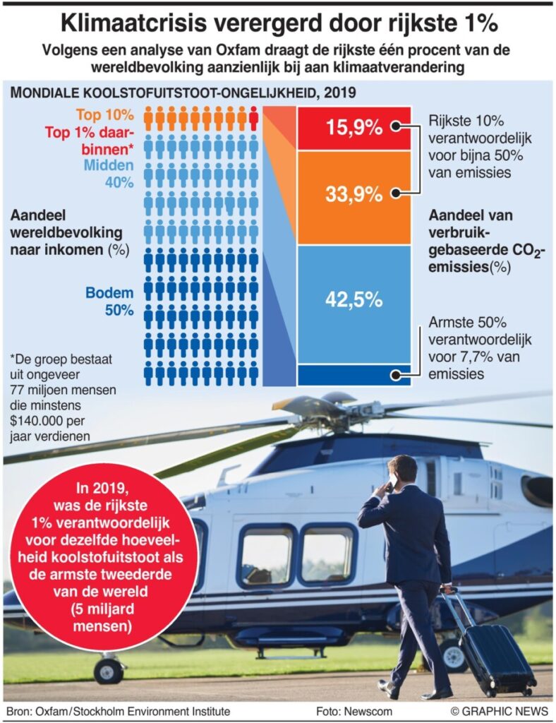 Een opmerkelijke analyse van de non-gouvernementele organisatie Oxfam, aan de vooravond van de internationale klimaattop COP28 in Dubai, onthulde dat de rijkste 1% van de wereld verantwoordelijk is voor een grotere CO2-uitstoot dan de armste 66%. Het rapport, getiteld ‘Climate Equality: A Planet for the 99%’, gebaseerd op onderzoek uitgevoerd door het Stockholm Environment Institute (SEI), legt bloot hoe de consumptie gerelateerd aan verschillende inkomensniveaus bijdraagt aan de klimaatproblematiek tot het jaar 2019.