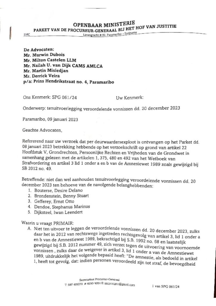Het Openbaar Ministerie (OM) heeft het verzoekschrift van het nieuwe advocatenteam van Desi Bouterse afgewezen. Het advocatenteam wilde dat de uitvoering van het vonnis in het 8 Decembermoordenproces tegen de oud-president en vier mede-veroordeelden zou worden stopgezet en dat uitvoering van de vonnissen wordt opgeschort.
