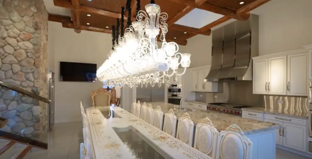 Dit huis heeft een houten balkenthema, waardoor het op een hut lijkt. Je merkt ook een liefde voor de klassieke kleurencombinatie van rood en wit. Dit is absoluut geen modern kleurenpalet. Het Isley Estate heeft een buitensportveld dat geschikt is voor basketbal, tennis en pickleball.
