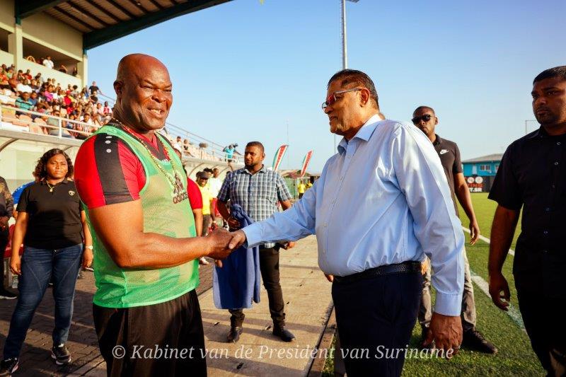 President Chandrikapersad Santokhi was als eregast aanwezig en mocht de aftrap verrichten.