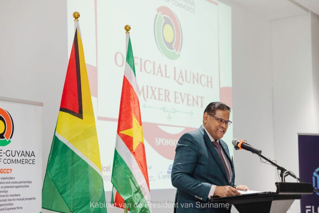 President Chandrikapersad Santokhi heeft zaterdag in Guyana de lancering van de Suriname-Guyana Chamber of Commerce (SGCC) bijgewoond. Hij zei in zijn toespraak, dat Suriname en Guyana investeringen en handel naar een hoger niveau moeten tillen. “Er zijn grote kansen voor intensieve en verhoogde samenwerking tussen het bedrijfsleven van beide landen”, sprak de president. Naast de ministers Albert Ramdin van Buitenlandse Zaken, International Business en Internationale Samenwerking (BIBIS) en Stanley Raghoebarsingh van Financiën en Planning, waren ook leden van de SGCC, corps diplomatique en ondernemers uit Guyana en Suriname aanwezig.