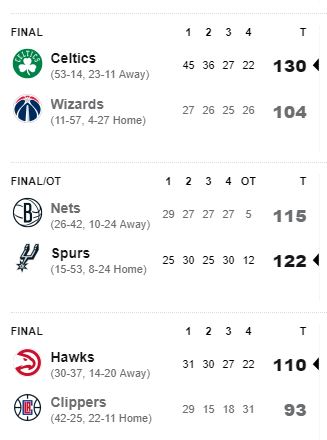 De Boston Celtics domineerden de Washington Wizards met 130-104, met Sam Hauser die een persoonlijk record vestigde van 30 punten en 10 driepunters. Ten slotte, de Atlanta Hawks herpakten zich na drie nederlagen op rij om de Los Angeles Clippers te verslaan met 110-93, mede dankzij een sterke prestatie van Dejounte Murray en De’Andre Hunter.