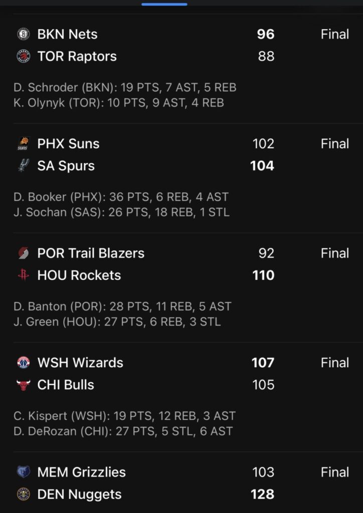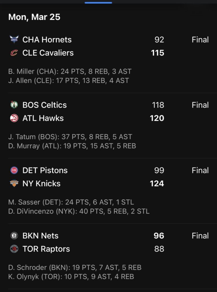 De Atlanta Hawks slaagden erin een achterstand van 30 punten weg te werken om de Boston Celtics met 120-118 te verslaan, mede dankzij cruciale bijdragen van Dejounte Murray en De’Andre Hunter. Dit spectaculaire herstel wordt gemarkeerd als de grootste comeback sinds 2002 in de NBA en markeert tevens Hawks’ grootste come-from-behind overwinning sinds de play-by-play era begon in 1997-98. Andere opvallende wedstrijden waren de New York Knicks die de Detroit Pistons versloegen met Donte DiVincenzo die een record brak met 11 driepunters, terwijl de San Antonio Spurs, zonder rookie ster Victor Wembanyama, knap wonnen van de Phoenix Suns. De Cleveland Cavaliers doorbraken een verliezende reeks met een overwinning op de Charlotte Hornets, en de Brooklyn Nets beëindigden een zes-game losing streak met een winst op de Toronto Raptors. Verder zegevierden de Washington Wizards over de Chicago Bulls, de Houston Rockets verlengden hun win-streak tegen de Portland Trail Blazers, en de Denver Nuggets handhaafden hun sterke vorm met een overwinning op de Memphis Grizzlies. De Dallas Mavericks boekten een cruciale winst tegen de Utah Jazz met een triple-double van Luka Doncic, terwijl de Sacramento Kings en de Indiana Pacers respectievelijk overwinningen behaalden op de Philadelphia 76ers en Los Angeles Clippers. Deze wedstrijden vormden een actievolle avond in de NBA, waarbij teams strijden voor hun plaats in het post-season.