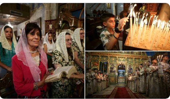 In weerwil van de Israëlische genocide houden Palestijnse christenen de Palmzondagmis in de Grieks-orthodoxe Sint-Porphyriuskerk in Gaza-stad.