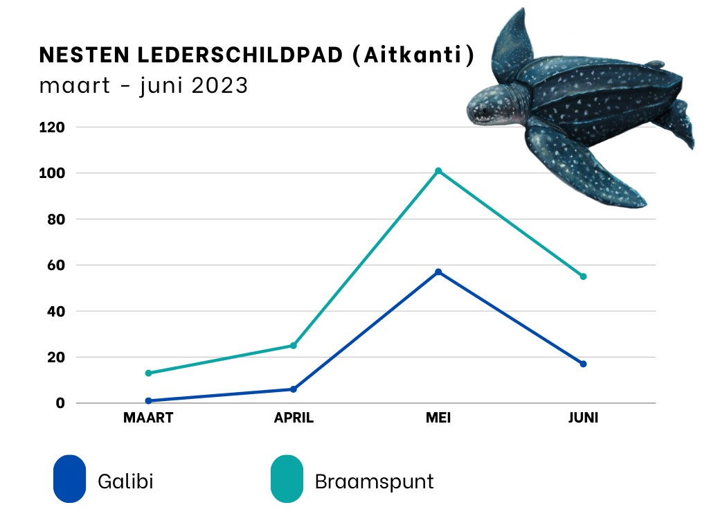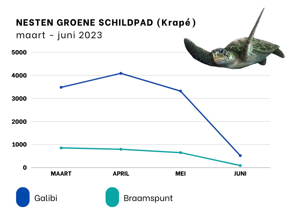In totaal zijn ruim 14.000 nesten geregistreerd, waarvan 98% van de groene schildpad (KrapƩ). Het aantal nesten in 2023 komt overeen met de verwachting, gebaseerd op gegevens die sinds 2001 zijn verzameld. Het totaal van slechts 272 lederschildpadnesten, met Braamspunt als het voornaamste legstrand, is echter reden tot grote bezorgdheid.