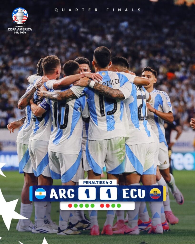 Argentinië bereikte de halve finale van de Copa America na een zenuwslopende penaltyreeks tegen Ecuador. Ondanks dat Lionel Messi een strafschop miste, redde doelman Emiliano Martínez twee pogingen, waardoor Argentinië met 4-2 na strafschoppen won na een 1-1 gelijkspel. Lisandro Martínez scoorde voor Argentinië, terwijl Kevin Rodríguez voor Ecuador gelijkmaakte in blessuretijd. Messi prees Martínez, die met zijn reddingen het verschil maakte. Argentinië speelt in de halve finale tegen Venezuela of Canada en stelt zich kandidaat voor een 16e Copa America-titel. Coach Lionel Scaloni was blij met de prestatie ondanks een zenuwslopende wedstrijd.