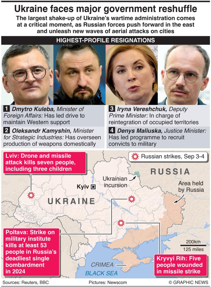 De grootste reorganisatie van het Oekraïense oorlogsbestuur vindt plaats op een kritiek moment, nu Russische troepen oprukken in het oosten en nieuwe golven van luchtaanvallen op steden ontketenen. De Oekraïense minister van Buitenlandse Zaken, Dmytro Koeleba, is tot nu toe het meest opvallende slachtoffer van een grote regeringsherschikking die werd bevolen door president Volodymyr Zelensky. Verschillende andere hooggeplaatste Oekraïense functionarissen hebben ook hun ontslag ingediend, waaronder wapenchef Oleksandr Kamyshin, minister van Justitie Denys Maliuska en vicepremier Iryna Vereshchuk. De afgelopen weken heeft Rusland bijna dagelijks massale aanvallen uitgevoerd op Oekraïense steden, met verwoestende gevolgen voor de burgerbevolking.