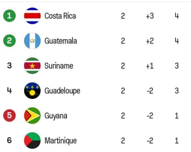 Om degradatie te voorkomen, moet Natio minimaal 6 punten behalen in de komende wedstrijden tegen Costa Rica en Guyana. Guyana speelt daarnaast ook tegen Guatemala, terwijl Martinique tweemaal tegen Guadeloupe speelt.
