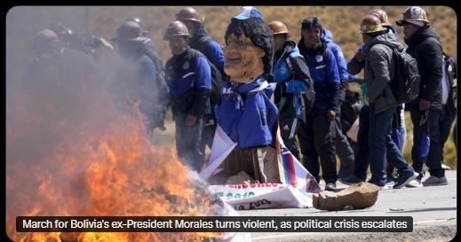 Duizenden anti-regeringsdemonstranten die marcheerden ter ondersteuning van Bolivia’s voormalige president Evo Morales botsten dinsdag met tegendemonstranten die hun de weg blokkeerden, wat de escalerende machtsstrijd illustreert in het onstabiele Andesland. Morales stuurde zijn volgelingen op een “Mars om Bolivia te redden,” een tocht van 190 kilometer van Caracollo naar de hoofdstad La Paz. De mars begon vreedzaam, maar werd uren later gewelddadig toen tegendemonstranten traangasbommen en vuurwerk gebruikten om bijna 10.000 demonstranten te confronteren. De aanhangers van Morales gebruikten katapulten en dwongen de tegendemonstranten zich terug te trekken. Volgens Eduardo Del Castillo raakten 13 mensen gewond, waaronder drie politieagenten.