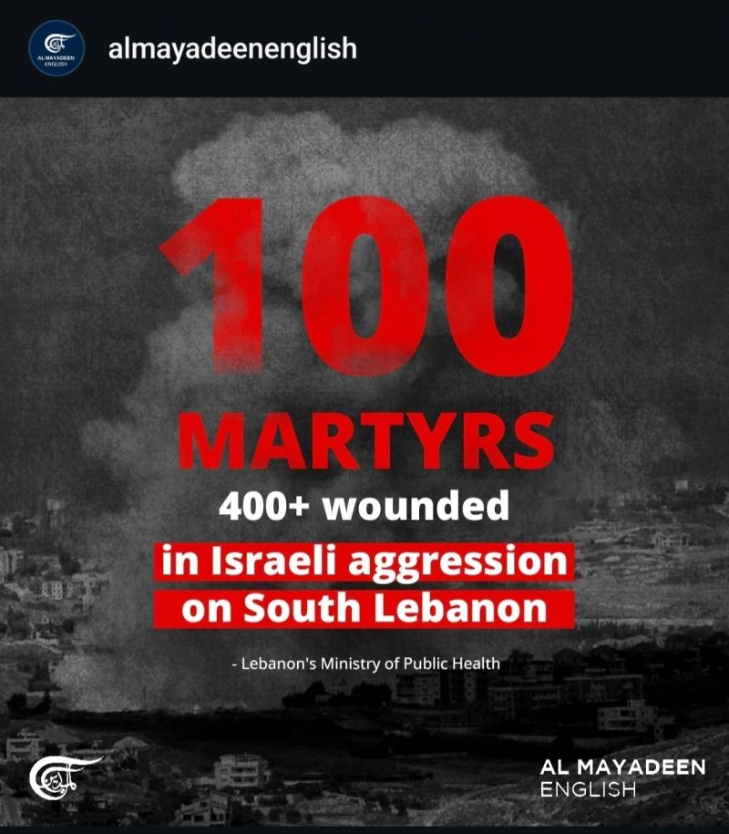 Israël de terreur sinds 1948 de bezetter van Palestina met steun van de VS en het VK, voert verwoestende aanvallen uit op Libanon. Vandaag vielen bij deze aanvallen 50 doden en raakten 300 personen gewond. Het Israëlische leger heeft ongeveer 300 Hezbollah-doelen aangevallen, wat de meest intense actie is sinds de oorlog van 2006. Tienduizenden Libanezen werden telefonisch gewaarschuwd om te evacueren. Een woordvoerder van het Israëlische leger bevestigde geplande aanvallen op Hezbollah-rakettenopslagplaatsen in de Beqaa-vallei.