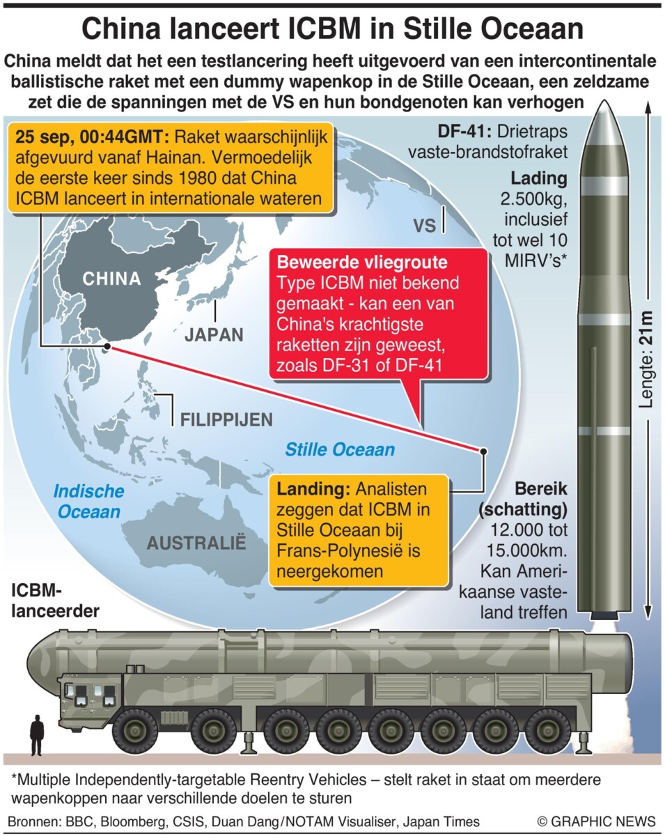 – China heeft een intercontinentale ballistische raket met een “dummy-kernkop” in de Stille Oceaan getest, een zeldzame actie die de spanningen met de VS en bondgenoten kan verhogen. De ICBM werd woensdagochtend gelanceerd en viel in de verwachte zeegebieden, volgens het Chinese ministerie van Defensie. Hoewel de details van de raket en de vliegroute onduidelijk zijn, meldde Chinese staatsmedia dat betrokken landen vooraf waren geïnformeerd. Dit is de eerste test in internationale wateren sinds 1980.