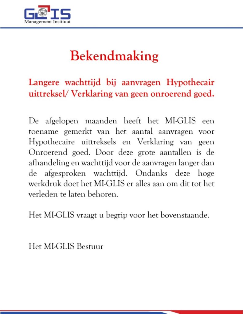 De wachttijden bij het Management Instituut voor Grondregistratie en Landinformatiesystemen (MI-GlIS) zijn de afgelopen weken verlengd. Dit heeft geleid tot enige vertraging in de dienstverlening, met name voor burgers die een hypothecair uittreksel of een bewijs van onroerend goed willen aanvragen.
