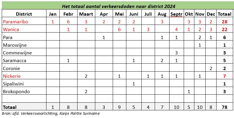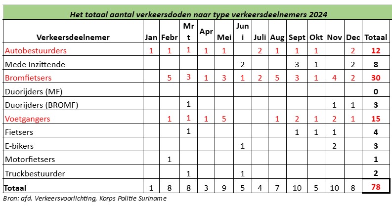 Purcy Landveld, onderdirecteur Data en Educatie van het Verkeersveiligheidsinstituut (VVI), geeft aan dat in het jaar 2024 er 78 verkeersdoden zijn geregistreerd, dit is 9 meer ten opzichte van het jaar 2023. Van de 78 verkeersdoden waren 30 bromfietsers, 15 voetgangers, 12 autobestuurders, 8 mede inzittende, 4 fietsers, 3 Duorijders (BROMF), 3 E-bikers, 2 truckbestuurders en 1 Motorfietsers. De meeste verkeersdoden vonden plaats in de districten Paramaribo (28), Wanica (22) en Nickerie (7). In de maand september werden de meeste slachtoffers geregistreerd nl. 10.