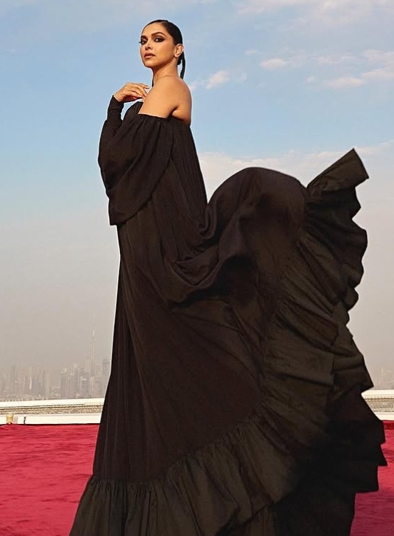De post toont haar gekleed in een lange, eenvoudig elegante zwarte jurk. Het was echter de enorme ketting die ze bij haar ensemble droeg die de show stal. Deepika’s zwarte jurk is van het designerlabel ‘JADE by Monica and Karishma’.