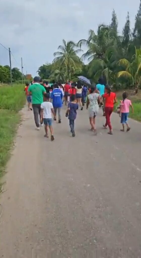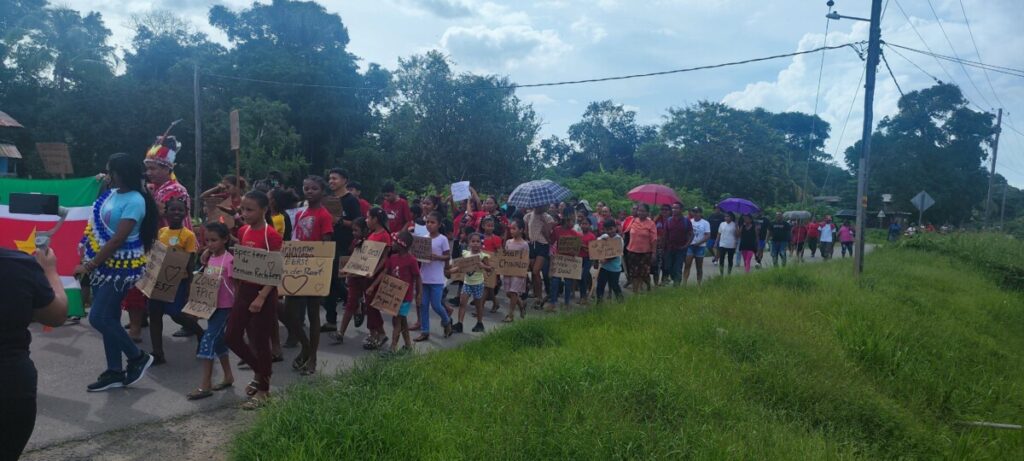 De demonstranten begonnen bij Washabo centrum en lopen naar Section, Apoera, Sandlanding en Apoera Haven, dat het eindpunt is van de protestloop.