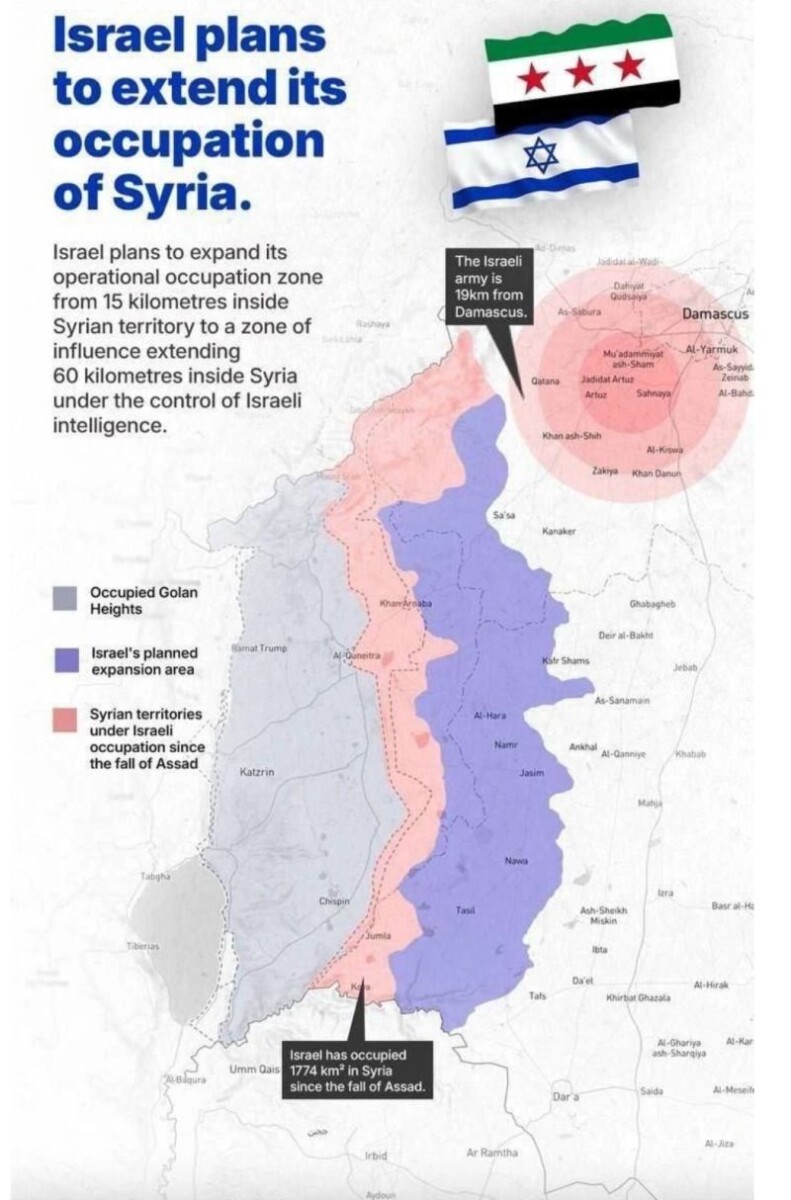 Uit rapporten blijkt dat Israël van plan is zijn controlegebied in Syrië (aangegeven in roze) uit te breiden en een nieuwe invloedszone (paars) te vestigen, op slechts 19 km van Damascus. Met stilzwijgende steun van Ahmed al-Sharaa, leider van Hayat Tahrir al-Sham, wil Israël militaire en inlichtingencontrole over West-Daraa veiligstellen. Turkije, dat een aanzienlijk deel van Syrië controleert, zal deze regeling waarschijnlijk met tegenzin accepteren.
