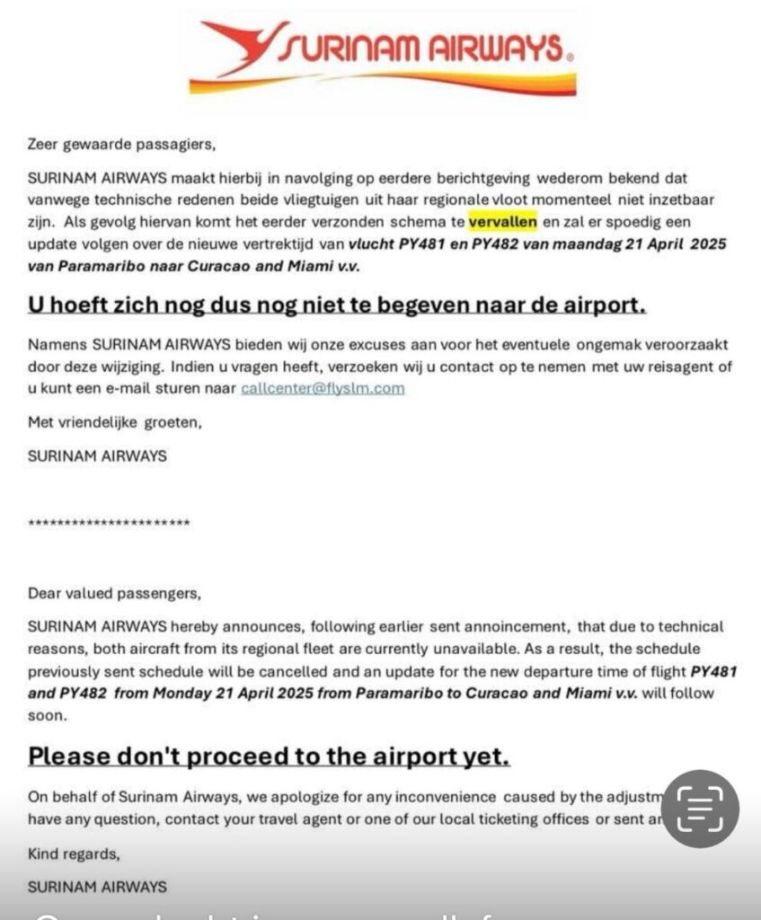 Surinam Airways (Surinaamse Luchtvaart Maatschappij, SLM) heeft bekendgemaakt dat vluchten PY481 en PY482 van vandaag, maandag 21 april, van Paramaribo naar CuraƧao en Miami (en terug) zijn vertraagd vanwege technische problemen met de regionale vloot.
