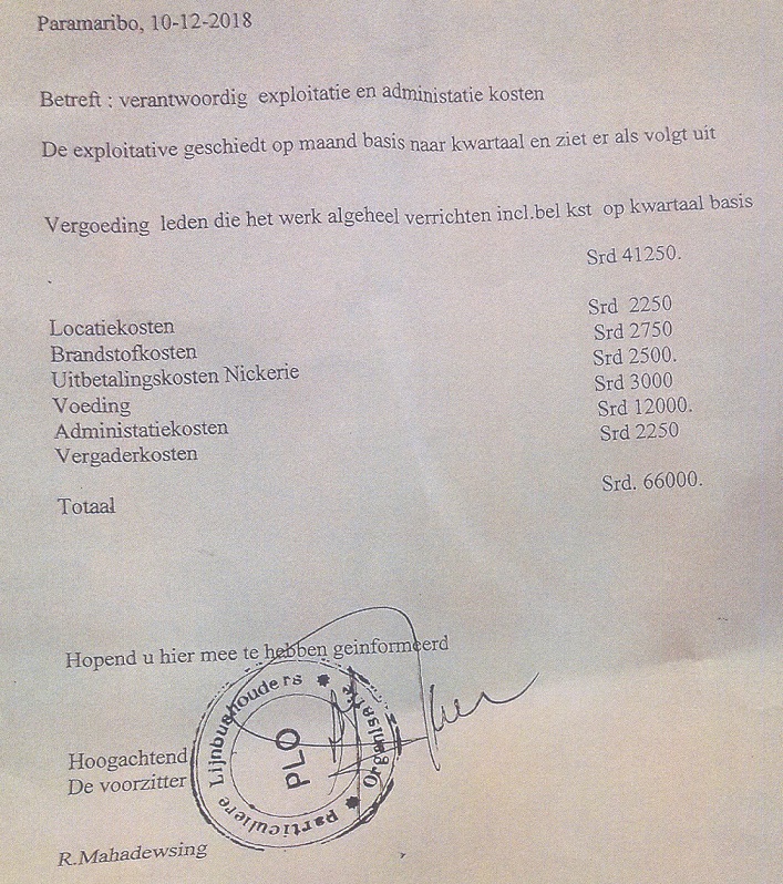 De Particuliere Lijnbushoudersorganisatie (PLO) heeft vanaf 2011, sinds de introductie van de brandstofcompensatie aan de bushouders, kosten in rekening gebracht voor de autoriteiten. Bij de distributie van deze financiële tegemoetkoming, die per kwartaal wordt overgemaakt naar de bankrekening van PLO, heeft het bestuur van deze belangenbehartigende organisatie per kwartaal SRD 66.000 getoucheerd. Dit blijkt uit een document waarop Dagblad Suriname de hand heeft weten te leggen. Het document is voorzien van een PLO-stempel en een handtekening van de PLO-voorzitter. De specificatie van de kosten van SRD 66.000 ziet er als volgt uit: vergoeding van de leden die de uitbetaling verrichten (SRD 41.250), locatiekosten (SRD 2.250), brandstofkosten (SRD 2.750), uitbetalingskosten in Nickerie (SRD 2.500), voeding (SRD 3.000), administratiekosten (SRD 12.000) en vergaderkosten (SRD 2.250).