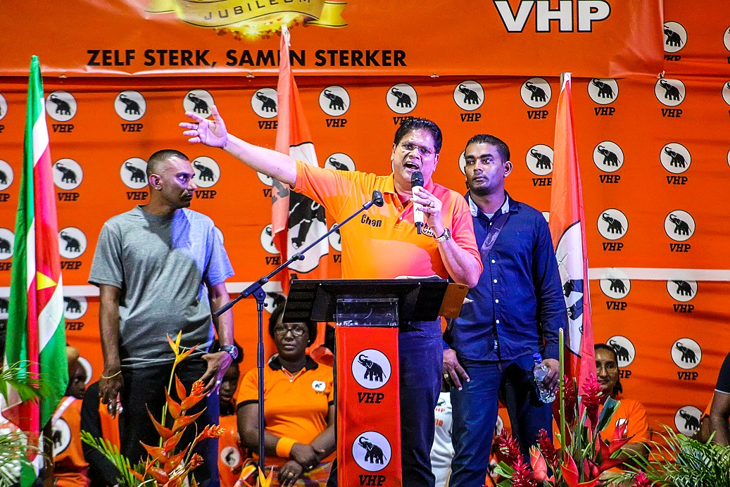 “De verkiezingen van 2020 zullen niet gaan tussen etnische groepen, tussen stad en district of tussen culturele groepen. De verkiezingen van 2020 zullen gaan tussen goed en kwaad. En het goede heeft zich vandaag gebundeld in Stichting De Olifant. We gaan het kwaad vernietigen.” Dit was de boodschap van VHP-voorzitter Chan Santokhi tijdens de politieke manifestatie in verband met het 70-jarig bestaan van de oranje partij. “We hadden gemikt op 10.000 aanwezigen, we zitten vandaag ver boven de 13.000 man. Dit is het bewijs dat de zwevende kiezers nu ook achter ons staan. De oranjetrein is niet te stoppen. Dit is een andere trein en geen spooktrein die vanuit de cassavefabriek van Para zou komen. Die spooktrein ligt op de berm. De orange movement zal stoppen bij eindhalte 28”, zei Santokhi, doelende op de 28 zetels die de partij als target heeft gesteld voor de komende verkiezingen. Op deze politieke manifestatie werden ook nieuwe leden gepresenteerd, die zich hebben aangesloten bij de VHP. Een van de bekende gezichten is Noreen Cheung, voormalig NDP-parlementariër, die een tijdje bij de NPS zat. Daarnaast is ook Cedric van Samson nu VHP’er, terwijl Miguel Abaas de Abop heeft verlaten voor de VHP.