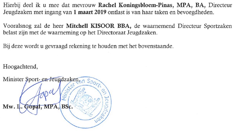Rachel Koningsbloem-Pinas is geen directeur meer van het directoraat Jeugdzaken van het ministerie van Sport- en Jeugdzaken. Minister Lalinie Gopal heeft haar per ingaande 1 maart ontlast van haar taken en bevoegdheden. Vooralsnog zal directeur Sportzaken, Mitchell Kisoor, de waarneming doen op Jeugdzaken. Dit is in een circulaire bekendgemaakt op het ministerie.