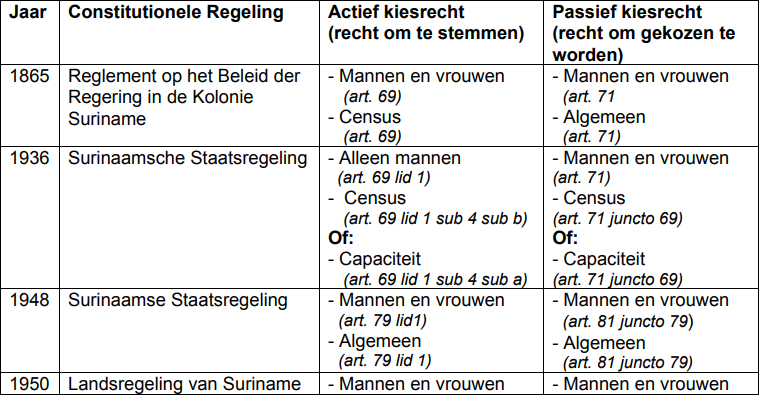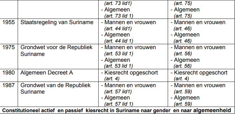 Het kiesrecht in Suriname is sinds 1865 constitutioneel verankerd en in alle constitutionele regelingen is dwingend een organieke wet voorgeschreven ter verdere uitwerking en uitvoering van de in die regelingen gegeven constitutionele kiesrechten. Sinds 1975 is er tevens het voorschrift dat die organieke wet met 2/3 meerderheid dient te worden goedgekeurd, als een waarborg voor stabiliteit en rechtszekerheid ter zake de wijze van uitoefening van het actief en passief kiesrecht in Suriname. 1 In deze open brief worden deze wetten – die aanvankelijk “Kiesreglement” en later “Kiesregeling” werden genoemd, alsmede de krachtens die regelingen gegeven besluiten – ook buiten beschouwing gelaten, omdat de focus zich hier slechts richt op het constitutioneel kiesrecht, met name het actief en passief kiesrecht, naar gender en naar algemeenheid.