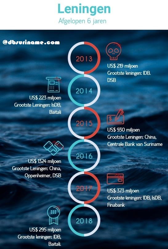 Frontfoto2De Surinaamse overheid heeft in de afgelopen jaren de leningenkraan flink opengehouden. In de afgelopen 6 jaren heeft de overheid in totaal 99 leenovereenkomsten ondertekend met zowel binnenlandse als buitenlandse ā€˜geldschieters’. In totaal is bijkans US$ 3 miljard geleend in deze 6 jaren, waarvan tweederde deel in het buitenland en de rest lokaal. De grootste geldschieters van de staat zijn Openheimer, China, de Islamic Development Bank (IsDB), Inter American Development Bank (IDB) en de Centrale Bank van Suriname (CBvS).