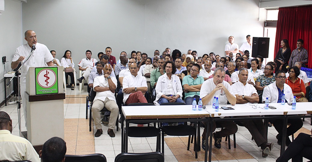 Pieter Voigt, voorzitter van de VMS, zei in het VMS-gebouw dat de uitspraken van Hasrat niet op persoonlijke titel zijn gedaan. “De uitspraken die hij heeft gedaan zijn gebaseerd op informatie waarover hij beschikt, uit hoofde van zijn functie als hoofd Medische Dienst. Deze gegevens hadden nooit op deze manier naar buiten gebracht mogen worden. Bovendien heeft hij gebruik gemaakt van een staatsmedium. Geen enkele zorgverlener wil op deze manier geschoffeerd en gecriminaliseerd worden”, liet Voigt weten. Dat een of meer zorgverleners bij het indienen van hun declaraties over de schreef zijn gegaan betekent niet dat een hele groep daarvoor verantwoordelijk gehouden kan worden. De VMS heeft haar ongenoegen in een brief kenbaar gemaakt aan De Nationale Assemblee (DNA) en aan de president. De beroepsgroep is zwaar teleurgesteld in de uitspraken van Hasrat. In de brief komt het vrij vertaald er dan ook op neer dat de specialisten aangeven dat Hasrat ruim baan moet maken. De goed bezochte persconferentie bewijst volgens Voigt dat de onvrede bij de gehele groep heerst.