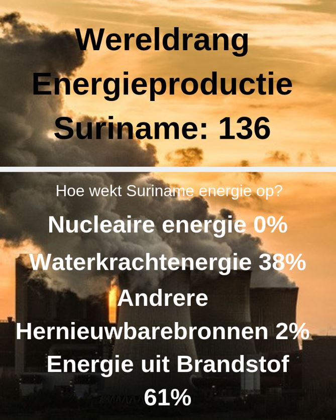 In Suriname is vaker de ambitie geuit om ook meer energie op te wekken uit hernieuwbare bronnen. De NV Energie Bedrijven Suriname levert elektriciteit die zij zelf opwekt en die zij toegeleverd krijgt van de centrales van Suralco uit Afobakka te Brokopondo en van Staatsolie te Livorno in Wanica. De Suralco levert jaarlijks ongeveer 900 GWh aan energie bij een gemiddeld vermogen van 100 MW. Deze energie wordt volledig gegenereerd met behulp van rivierwater uit het Afobakka stuwmeer in het district Brokopondo. Staatsolie levert de EBS ruim 440 GWh bij een gemiddeld vermogen van ruim 50 MW, waarbij de aandrijfmotoren voor de generatoren zware olie (HFO) als brandstof van Staatsolie gebruiken. De rest van het gevraagde vermogen (ongeveer 45% van het landelijk gebruik) wordt door de EBS zelf opgewekt in de verschillende locaties waar zij centrales heeft staan. De opwekcapaciteit aan de Saramaccastraat nu meer dan 120 MW, terwijl in de overige zeven districten de opwekcapaciteit ruim 35 MW bedraagt. De EBS zelf wekt jaarlijks meer dan 500 GWh elektrische energie landelijk op. Deze energie wordt deels met behulp van diesel en deels met zware olie in de aandrijfmotoren van de generatoren opgewekt. De goedkoopst opgewekte elektriciteit in Suriname komt uit Afobakka.