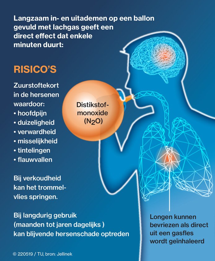 HMC noemt het een zorgwekkend fenomeen. De letsels door lachgas kunnen ernstig zijn. Jongeren belanden in het ziekenhuis met neurologische klachten. Ledematen voelen verdoofd aan of vingers en tenen tintelen. Ook zien ze, aldus de zegsvrouw, in het ziekenhuis jongeren binnenkomen met brandwonden, vooral in de luchtpijp en op de bovenbenen. Inmiddels zijn er ook voorbeelden bekend van mensen die een ongeluk krijgen. Zelfs uren na gebruik van lachgas, is het concentratievermogen zo laag dat opletten moeilijk is. In deze regio werd dat deze week voor het eerst echt duidelijk bij een ongeluk in Rijswijk. Een 18-jarige automobilist knalde op de Sir Winston Churchilllaan hard op de middenberm en ontwortelde een boom. Hij zat met nog drie andere jongeren in de auto. Van de voorkant van de auto was niet veel meer over. Wonder boven wonder raakten de jongelui zelf alleen maar lichtgewond. Dankzij een getuige, die had gezien dat een flesje lachgas uit de auto werd gegooid, werden ze betrapt.