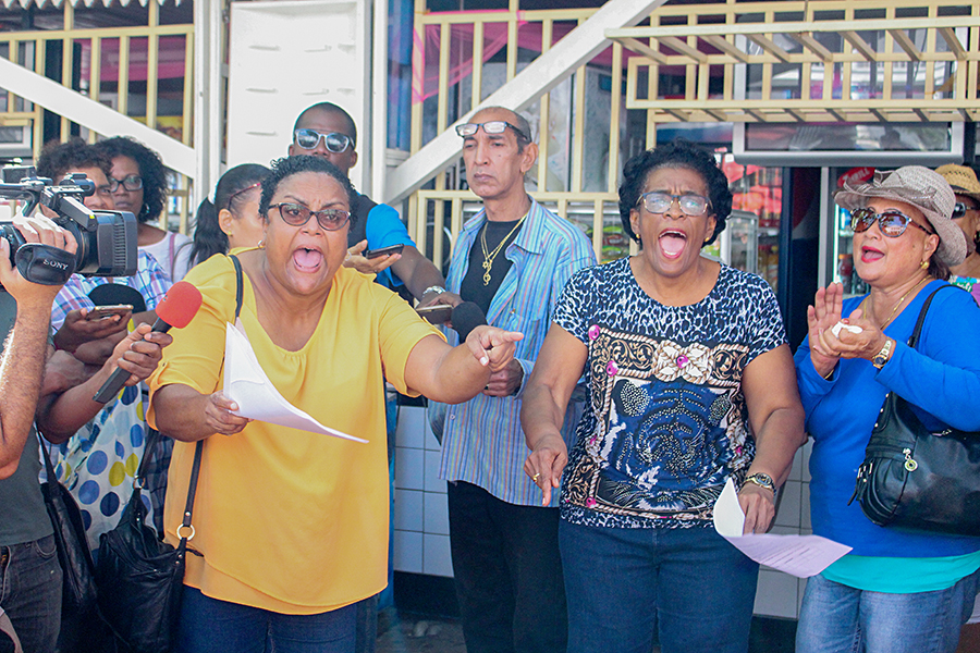 De groep vulde rond 11.30 uur minstens de stoep van de CBvS, en een kleine groep mocht naar binnen om de eerste petitie te overhandigen. Die werd door verantwoordelijken van dat moment bij de Centrale Bank in ontvangst genomen. Daarna liep de gehele groep naar het gebouw van DNA, waar de griffier, Ruth Lucia de Windt, de petitie in ontvangst mocht nemen na een toelichting van Sheombar. Het publiek met bordjes waarop leuzen te lezen waren, zoals “Pe un moni de”, “Handen af van ons geld!” en “Opsluiten de boevenbende” was niet te spreken over de ontstane situatie, en liet ook flink van zich horen.