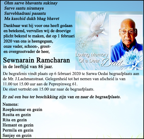 Overlijdensbericht Ramcharan Geplaatst op februari 6, 2020februari 6, 2020 Bericht navigatie VolgendeDankbetuiging Van den Berg
