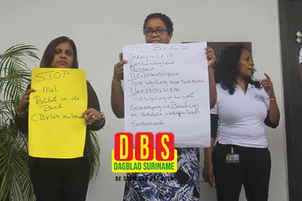 Gisteren omstreeks 9.00 uur was er bij de Centrale Bank van Suriname (CBvS) een prikactie van het personeel, die zowat 45 minuten duurde. Felicia Patterson, secretaris van de bond bij de CBVS en personeelslid van de bank, zegt in gesprek met Dagblad Suriname dat het bij het personeel erom gaat dat de regering bij haar beslissingen ook het personeel moet betrekken, zodat de kernwaarden van de bank hoog gehouden worden (zie foto). De veerkracht van de bank, het vertrouwen maar ook een stukje autonomie zijn voor bond en personeel bij de CBVS heel belangrijk, en dat is er nu niet. De hele situatie met ex-governor Van Trikt heeft niet alleen de bank, maar ook het personeel een slechte naam bezorgd, en medewerkers worden er door burgers op aangesproken. Dit is een zeer onprettige situatie, zegt Patterson.
