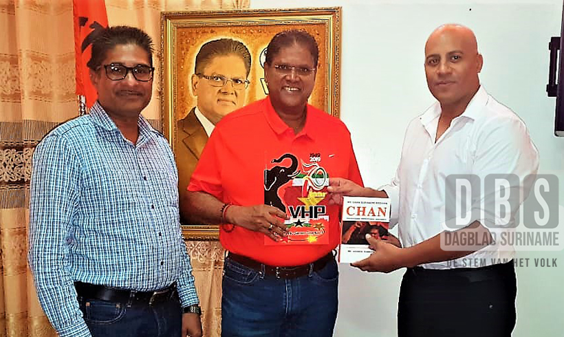 VHP voorzitter Chan Santokhi bedankte de heer Rodney Bouterse dat hij bereid is de VHP te ondersteunen en Suriname te helpen redden. Uit handen van de VHP voorzitter mocht de heer Rodney Bouterse, een exemplaar van het boek “Chan” in ontvangst nemen.