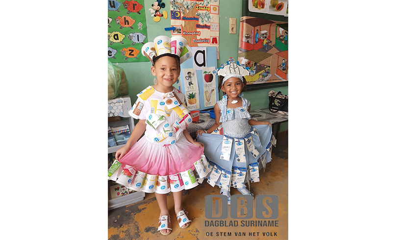 In deze periode vieren de verschillende scholen het carnavalsfeest. Afgelopen vrijdag hebben ook de kleuters van de OS Karghi Vishnudattschool aan de Derde Rijweg dit feest gevierd. De kinderen hebben enorm genoten van deze dag, omdat ze het leuk vonden om verkleed te gaan. Een creatieve moeder, Janelle Oosterling, heeft zich weer van haar beste kant laten zien. Zij heeft op deze dag gekozen voor melk en melkproducten. Ieder jaar kiest zij een bedrijf uit dat door middel van de kleding tot uiting wordt gebracht. Oosterling gaf aan de krant door dat zij modeontwerpster en docent is op het CPI. Zij benadrukt dat niet alles weggegooid hoeft te worden, “omdat er altijd iets gemaakt kan worden”. Zij heeft voor haar jongste dochter een kostuum gemaakt van Pro Life dozen en voor de oudste met MCP yoghurt cups. “Iedere dag worden deze producten in huis gehaald. Melk is goed voor kinderen, vandaar dit thema.” Beide kostuums zijn in de smaak gevallen bij de leerkrachten, ouders en leerlingen.