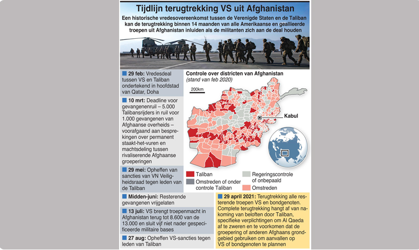 Under the deal, the U.S. would reduce its forces to 8,600 from the current total of 13,000 within the next three to four months, and the remaining troops would leave within 14 months. The withdrawal depends on the Taliban meeting its counterterrorism commitments, including a rejection of Al Qaeda and other groups. The deal does not, however, tie the U.S. withdrawal to any specific outcome from the all-Afghan talks, according to U.S. officials.