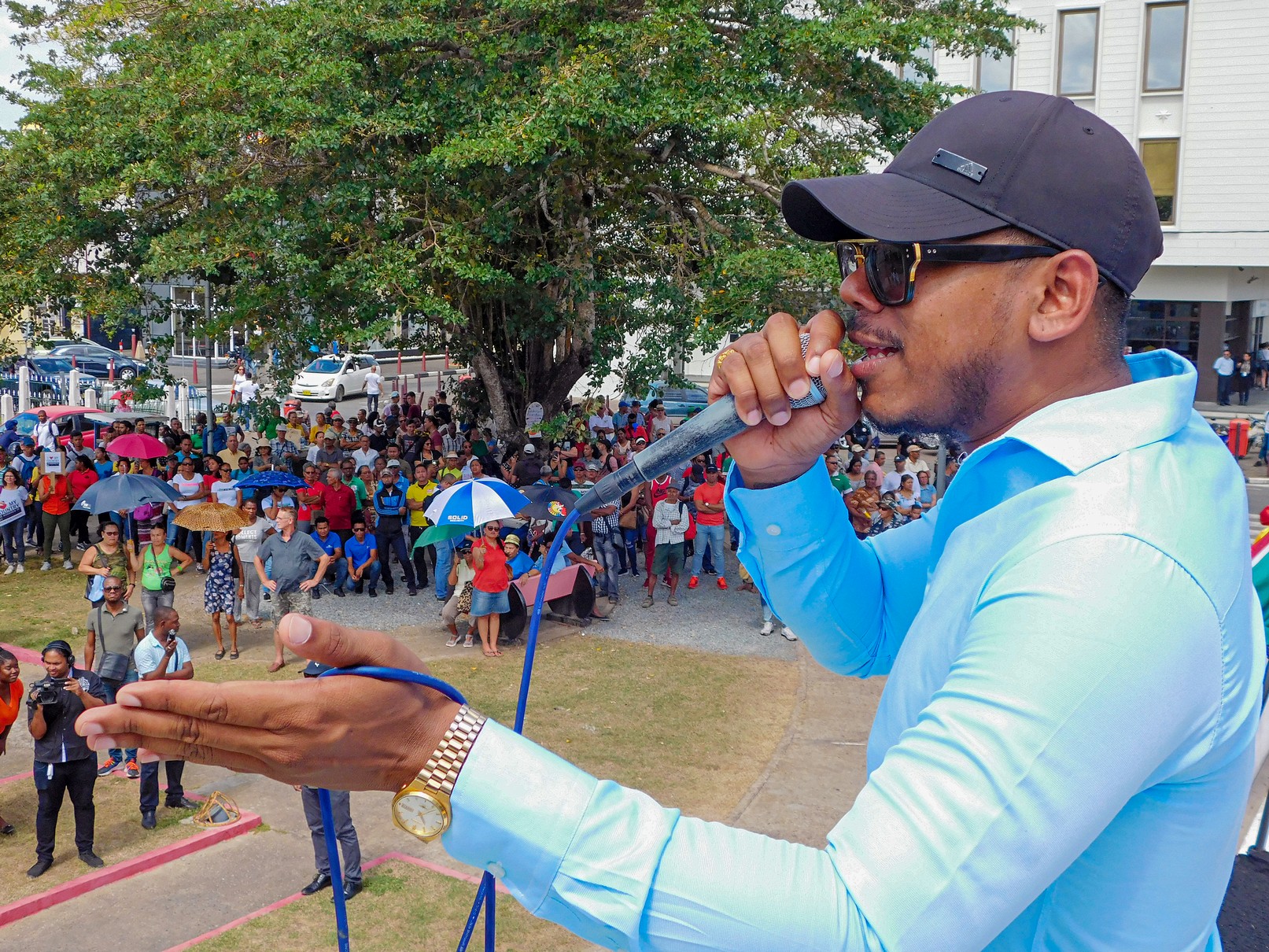 “Ons doel is vooral de mensen, in dit geval de jongeren, de first voters, duidelijk te maken dat ze absoluut niet mogen stemmen op boeven, op mensen zonder moraal en zonder integriteit, op veroordeelde criminelen. Dat ze bewust stemmen op 25 mei en kiezen voor kundige en integere mensen. En ofschoon er veel studenten waren, kwamen vele ook niet omdat ze bedreigd zijn geworden door NDP-leraren, die ze gewaarschuwd hebben dat als ze gaan protesteren, ze het aan hun cijfers zouden merken. Sommige leraren durfden zelfs in telefoons van leerlingen te gaan om te zien of ze met mij communiceerden. Maar ook de seniorenburgers kwamen in wat mindere mate, omdat ze juist vandaag, 6 maart, opgeroepen zijn om gelden te gaan ontvangen, en toch was de opkomst goed. Dat niet alleen, de opkomst was kwaliteit, en dat kan niet gezegd worden van Bouterse zijn meetings. Die worden in de koele middag gehouden, mensen worden met bussen vervoerd, ze krijgen eten en drinken en petten en paraplu’s en vaak zelfs cash geld. Onze mensen komen omdat ze niet meer uitkomen, omdat alles te duur wordt, omdat de koers elke dag klimt, omdat de ziekenzorg eronder lijdt, omdat deze regering steelt, en omdat men geen toekomst meer ziet door dit beleid.”