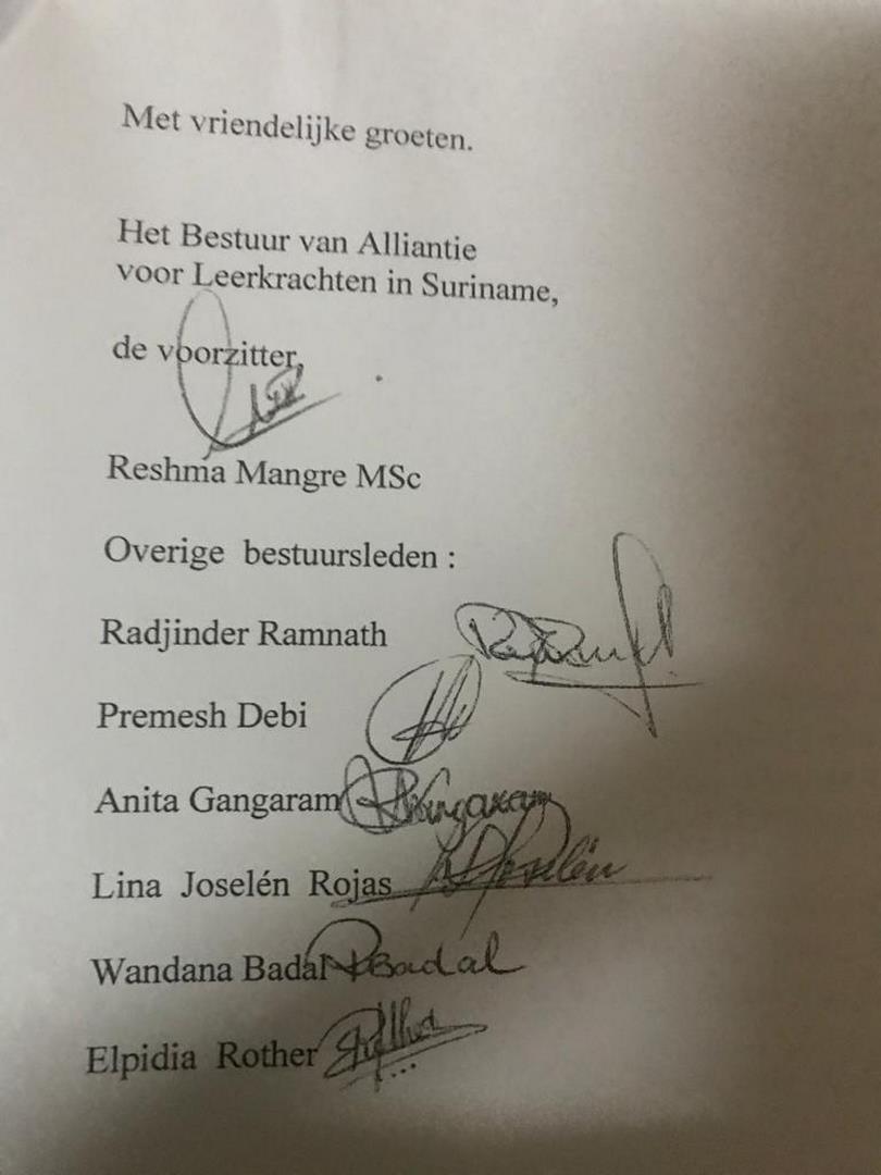Volgens enkele bestuursleden van de Alliantie van Leerkrachten in Suriname (ALS) handelt hun voorzitter Reshma Mangre buiten de statuten en voert zij een dictatoriaal beleid. Rabin Balesar (ondervoorzitter), Helia Wangsarana (secretaris-generaal), Sharita Bhugoea (eerste penningmeester) en Winish Imansoeradi (tweede penningmeester) zijn ontevreden over het handelen van Mangre. De bestuursleden delen via een perscommuniqué mee dat er binnen het ALS-bestuur een ernstige vertrouwenscrisis is ontstaan. “De voorzitter heeft vergaande rancuneuze handelingen gepleegd, waaronder de bondsdagen van de eerdergenoemde bestuursleden te laten intrekken door het Onderwijsministerie en door het stichtingsbestuur Sanatan Dharm, nadat bovengenoemde personen vragen hebben gesteld over financiële handelingen gepleegd door de voorzitter”, staat in het perscommuniqué. Bestuursleden zouden door Mangre onterecht geroyeerd zijn.