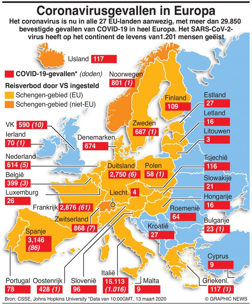 Coronavirus nu in alle EU-landen Geplaatst op maart 14, 2020 HET CORONAVIRUS IS NU IN ALLE 27 EU-LANDEN AANWEZIG, MET MEER DAN 29.850 BEVESTIGDE GEVALLEN VAN COVID-19 IN HEEL EUROPA. Het SARS-COV-2- virus heeft op het continent de levens van1.201 mensen geëist. Bericht navigatie VorigeLaatste nieuws coronavirus:VolgendeHet coronavirus spaart niemand