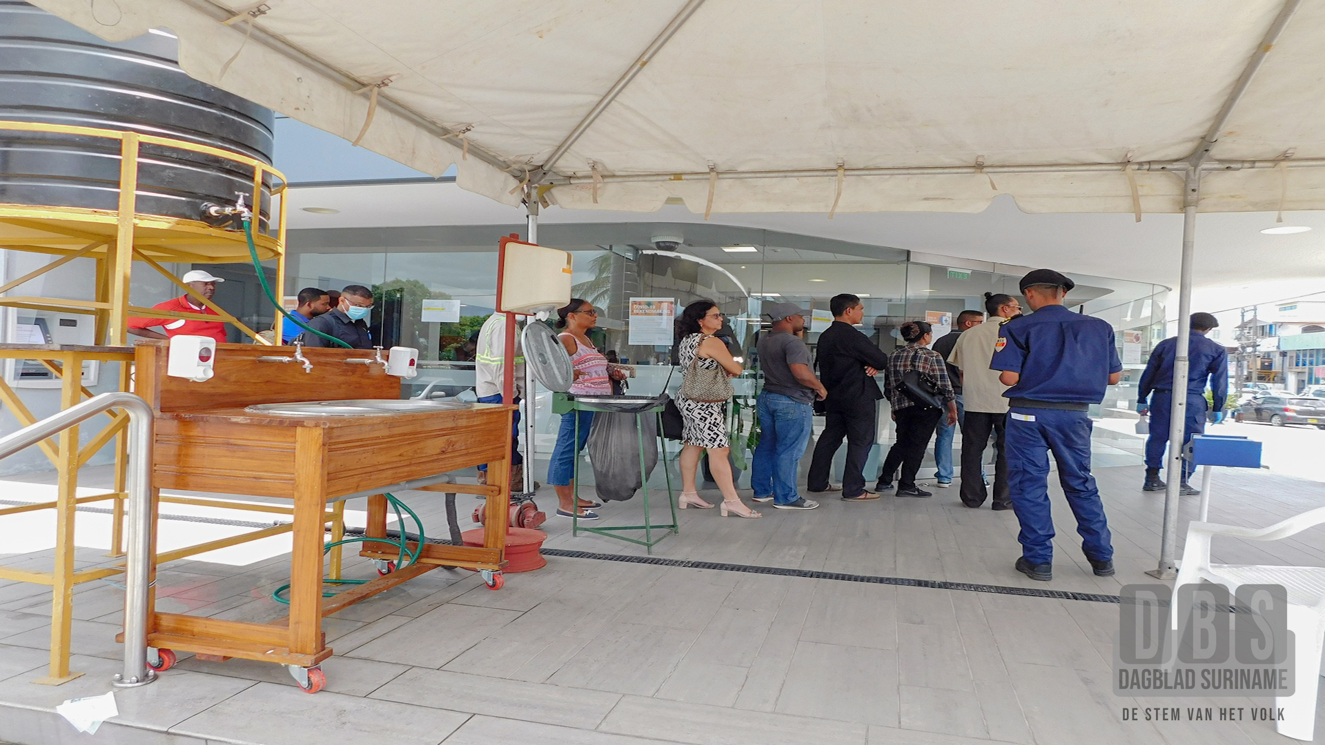 Ook de commerciële banken hebben de alertheid opgevoerd voor wat betreft de bescherming van werknemers en cliënten tegen de verspreiding van het Covid-19, Coronavirus. Bij het filiaal van de Hakrinbank aan de Tourtonnelaan werden bezoekers allereerst onderworpen aan een strenge controle. Naast een controle van een medewerker op eventuele symptomen van het virus, werden cliënten verplicht de handen goed met zeep te wassen bij een wasbak. Hierna moesten de mensen hun handen desinfecteren met handsanitizer alvorens zij in kleine groepen werden binnengelaten. Een durotank werd buiten, vlak voor de deur, geplaatst om voor voldoende water te zorgen. Vanaf gisteren concentreert de dienstverlening aan klanten zich op de filialen Tourtonne, Nieuwe Haven, Flora en Nickerie. De irritatie bij veel burgers in de lange rijen was duidelijk te merken.