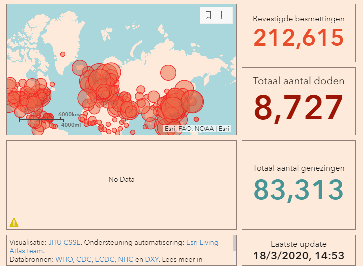Het aantal geregistreerde besmettingen in China op woensdag 18 maart is 81.086 tegen 81.058 op dinsdag. Dat zou betekenen dat in heel China slechts 28 nieuw gevallen erbij kwamen, afgaande op de cijfers van de Amerikaanse universiteit.