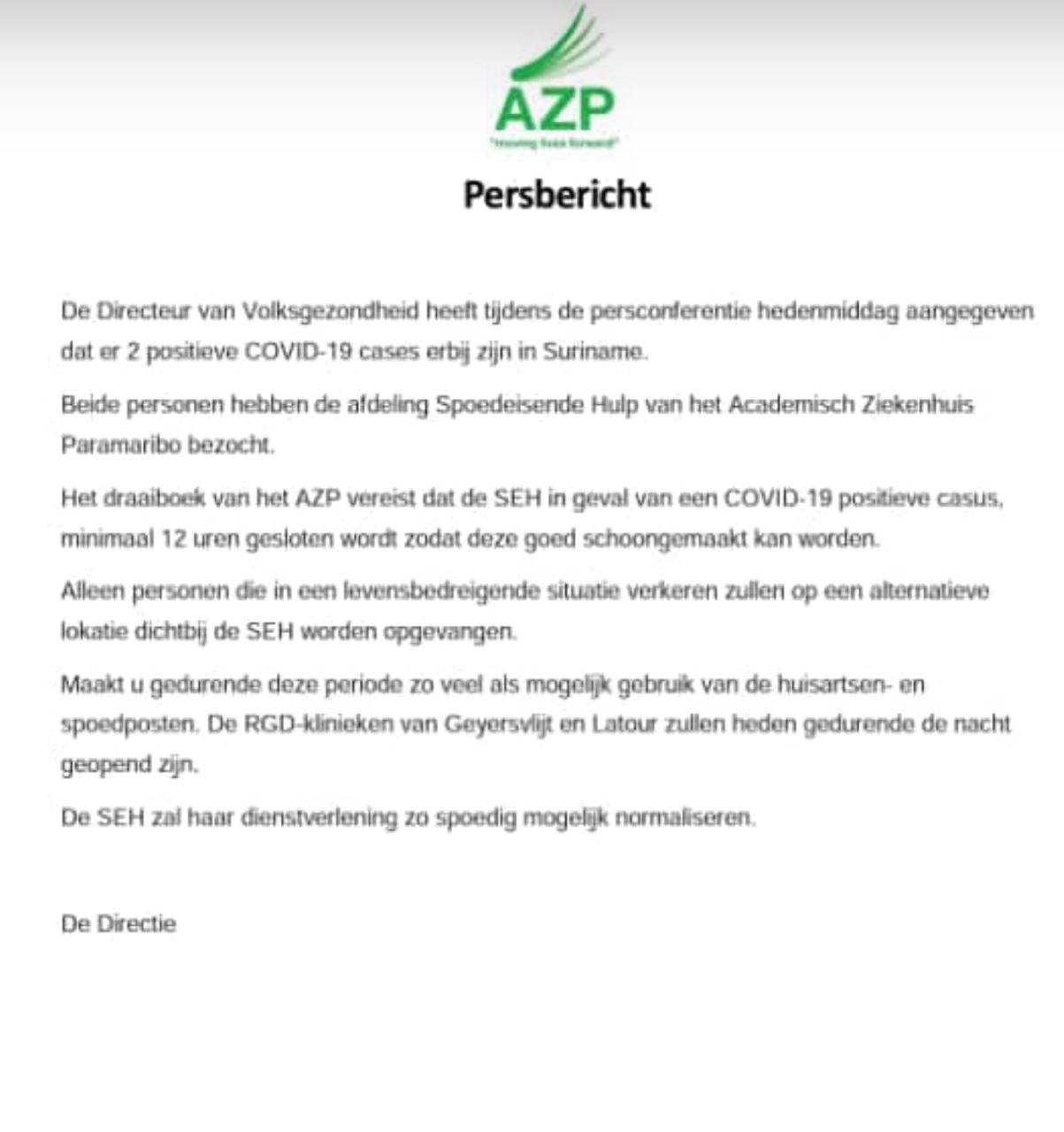 “Maakt u gedurende deze periode zo veel als mogelijk gebruik van de huisartsen- en spoedposten. De RGD-klinieken van Geyersvlijt en Latour zullen heden gedurende de nacht geopend zijn. De SEH zal haar dienstverlening zo spoedig mogelijk normaliseren.”, aldus de directeur van het AZP