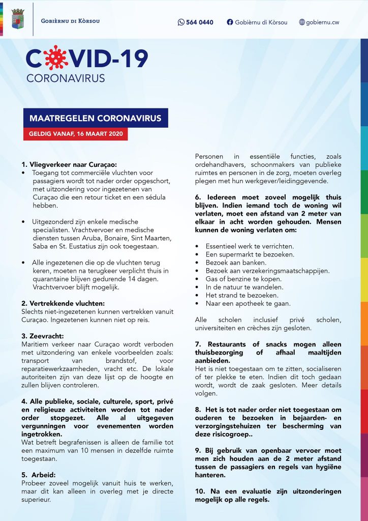 Ook op Curaçao zijn vanaf 16 maart strenge maatregelen van kracht in verband met het Coronavirus.