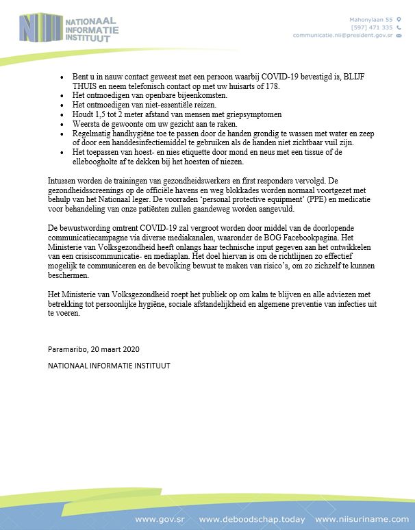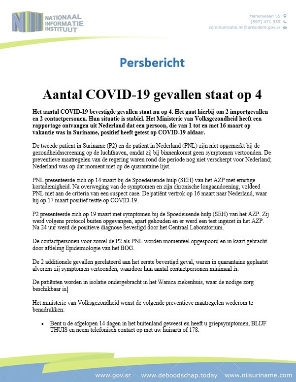 Het Nii heeft vandaag een persbericht uit doen gaan waarin onder andere aangegeven wordt dat de teller van het aantal positief bevestigde gevallen Coronavirus nu op 4 staat.