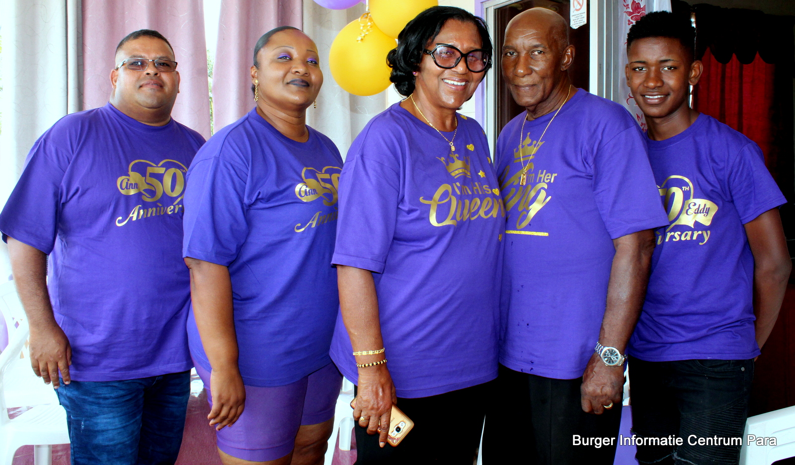 Eduard (72) en Antoinette (69) Cramer – Kotzebue van Zanderij wooncentrum, vieren vandaag hun vijftig jarig huwelijksjubileum. Bij dit heugelijk feit bracht de districtscommissaris van Para, Armand Jurel, een bezoek aan het echtpaar om hen namens de President van de Republiek Suriname te feliciteren en hen een enveloppe en bloemstuk te overhandigen.