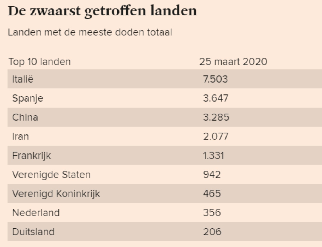 China heeft nog altijd te kampen met de meeste besmettingen, 81.782 gevallen. Op nummer twee staat Italië met 80.589 mensen die het virus onder de leden hebben. De VS volgen daarna met 76.514 gevallen. Op geruime afstand volgt Nederland (7.459).