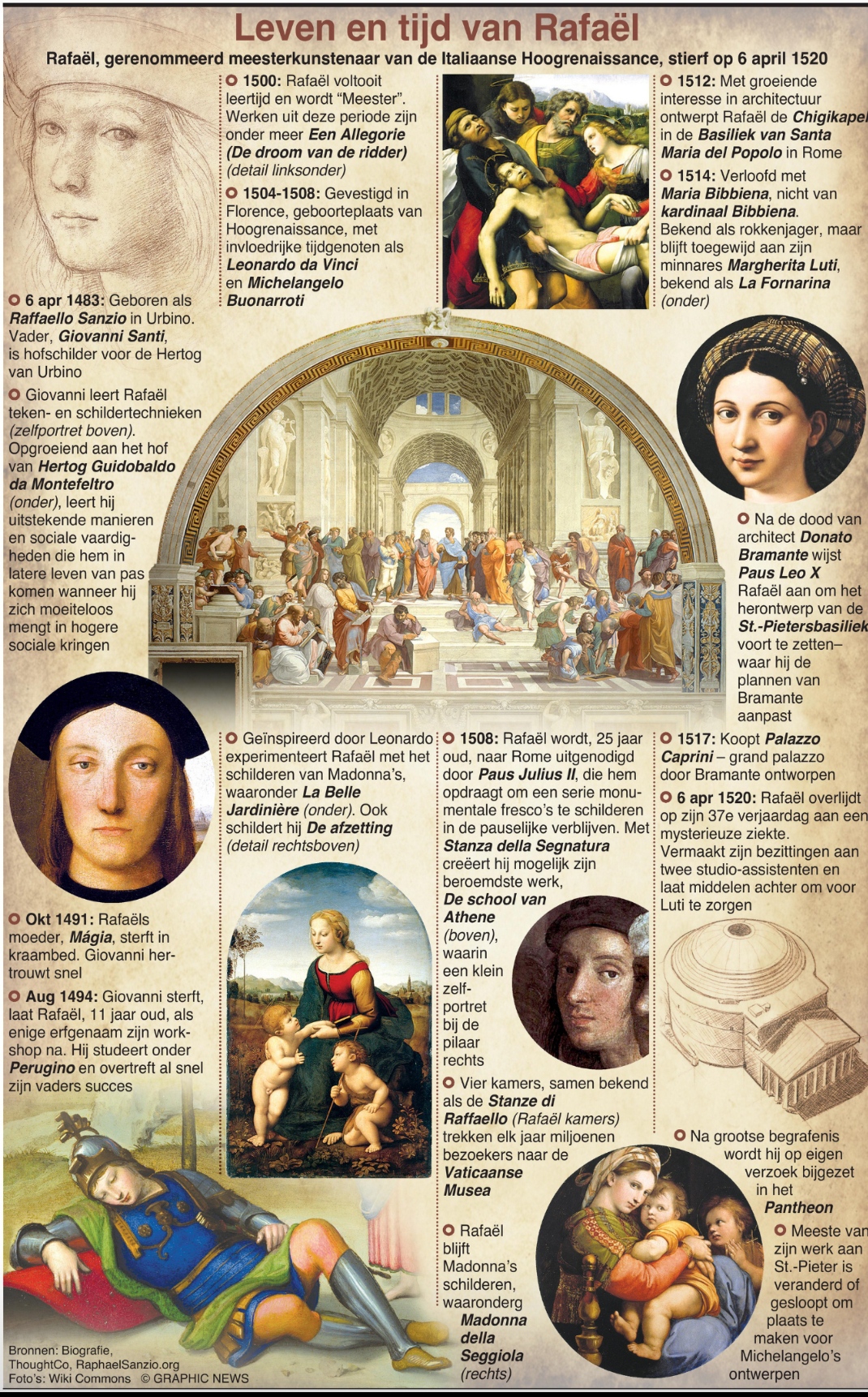RAFFAELLO SANZIO DA URBINO, BEKEND ALS RAFAËL, DE GERENOMMEERDE ITALIAANSE KUNSTENAAR EN ARCHITECT UIT DE HOOGRENAISSANCE, STIERF OP 6 APRIL 1520, SLECHTS 37 JAAR OUD.
