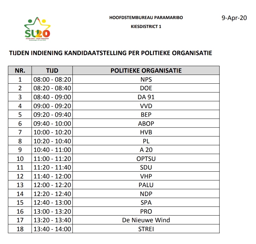 Op donderdag 9 april vindt vanaf 08:00 uur de indiening plaats van de kandidaatstelling van de politieke partijen op het hoofdstembureau in Paramaribo.