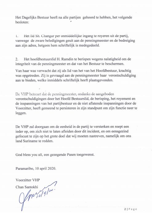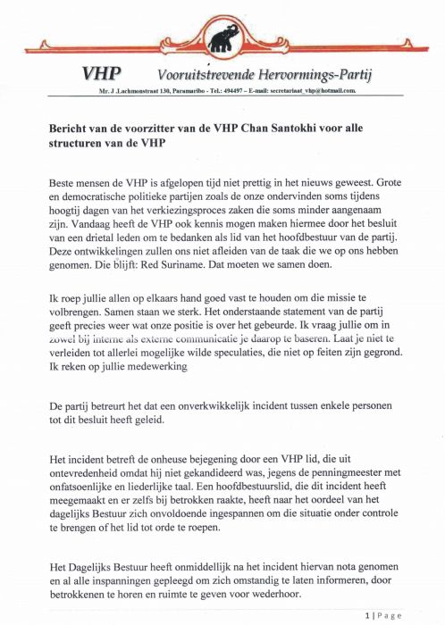 De voorzitter van de VHP, Chan Santokhi, geeft in een bericht aan de structuren informatie over het uittreden van drie leden als lid van het Hoofdbestuur: